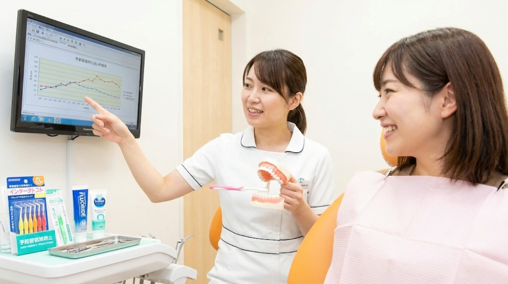 歯科衛生士から正しいブラッシング方法や、デンタルフロス・歯間ブラシの使い方を学ぶことで、セルフケアの質を高められます。