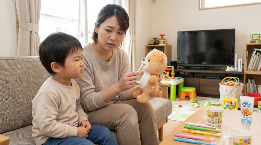 小さなお子さまの場合、歌を歌いながら磨く、鏡でお口の中を見せる、お気に入りのぬいぐるみの歯を先に磨く「ごっこ遊び」などが有効な工夫になります。歯ブラシや歯磨き粉をお子さま自身に選ばせるのも、自発性を引き出す方法のひとつです。