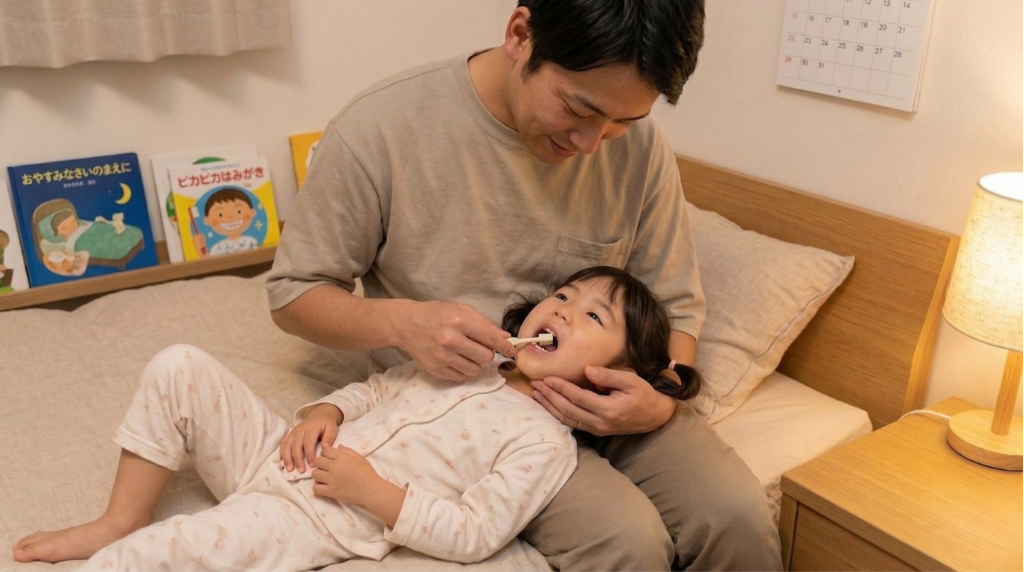 仕上げ磨きのタイミングは、1日のうち就寝前が最も重要です。睡眠中は唾液の分泌量が減り、口腔内の自浄作用が低下するため、就寝前にしっかり汚れを落としておくことが虫歯予防の鍵になります。毎食後の仕上げ磨きが難しい場合は、最低限「夜だけは必ず」を徹底するだけでも虫歯リスクは大幅に下がります。忙しい朝は子ども自身の歯磨きに任せ、夜は保護者がしっかり仕上げるという分担も現実的な選択肢です。