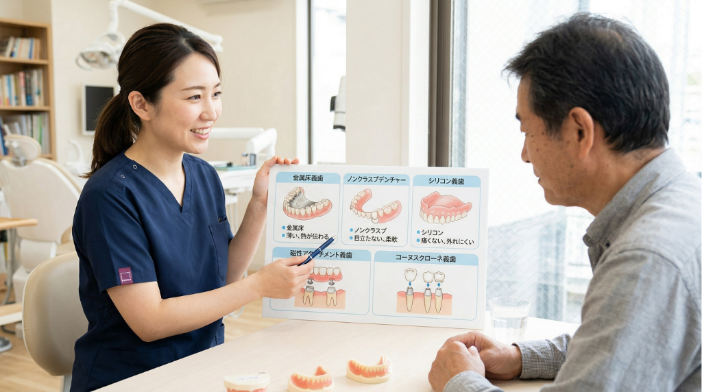 見た目を重視するならノンクラスプデンチャー、食事の快適さを重視するなら金属床義歯、安定した固定力を求めるなら磁性アタッチメントやコーヌスクローネ。優先順位を明確にすることで、選択の軸が定まります。