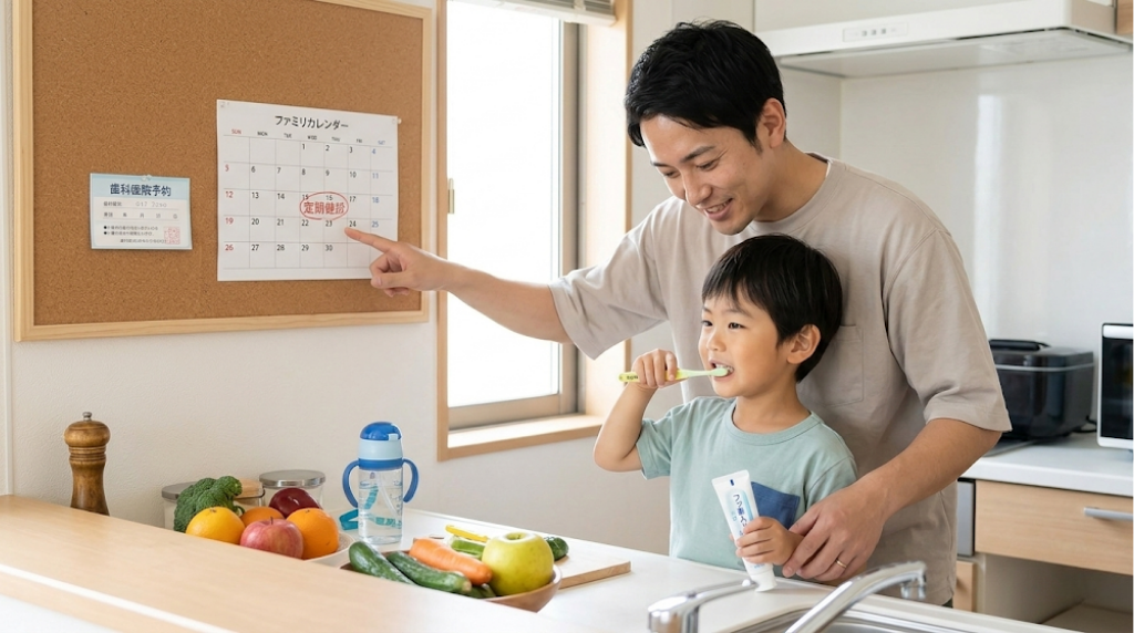 おやつの回数や時間を決めずに、だらだらと食べ続ける習慣は虫歯リスクを高める最大の要因のひとつです。先述のとおり、口に食べ物が入るたびに歯の表面では脱灰が起こります。時間を決めて食べ、食べ終わったら水やお茶で口をゆすぐ習慣をつけるだけでも、口腔内環境は改善に向かいます。