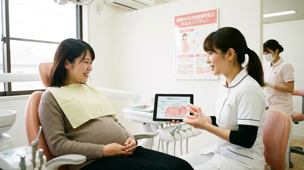妊娠中は女性ホルモンの変化、唾液量の減少、つわりによる口腔ケア不足などが重なり、虫歯や歯周病のリスクが高まる時期です。歯周病は早産や低体重児出産との関連も指摘されているため、お母さんと赤ちゃん両方の健康のために、適切な予防ケアが欠かせません。